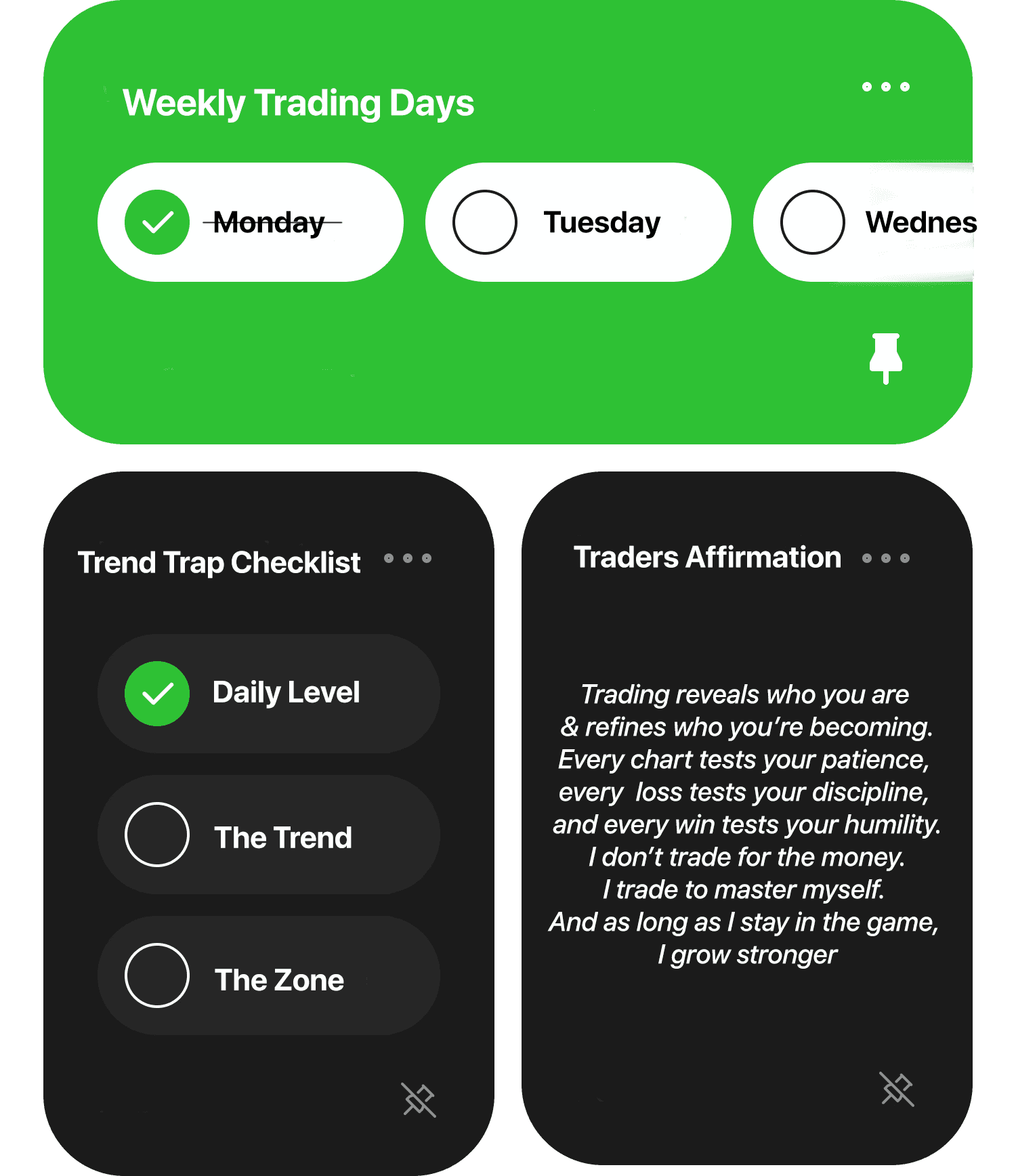 Trend Trap isn’t just a tool, it’s a habit system. From choosing your trading days to completing your pre-trade checklist, every feature is designed to help you form the routines that lead to longevity in the markets. Checklist → Affirmation → Execution